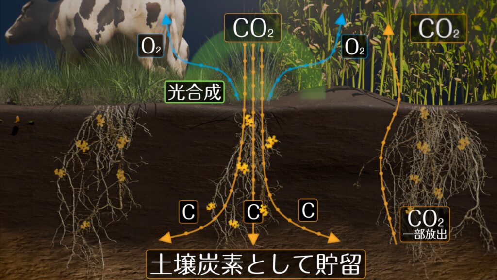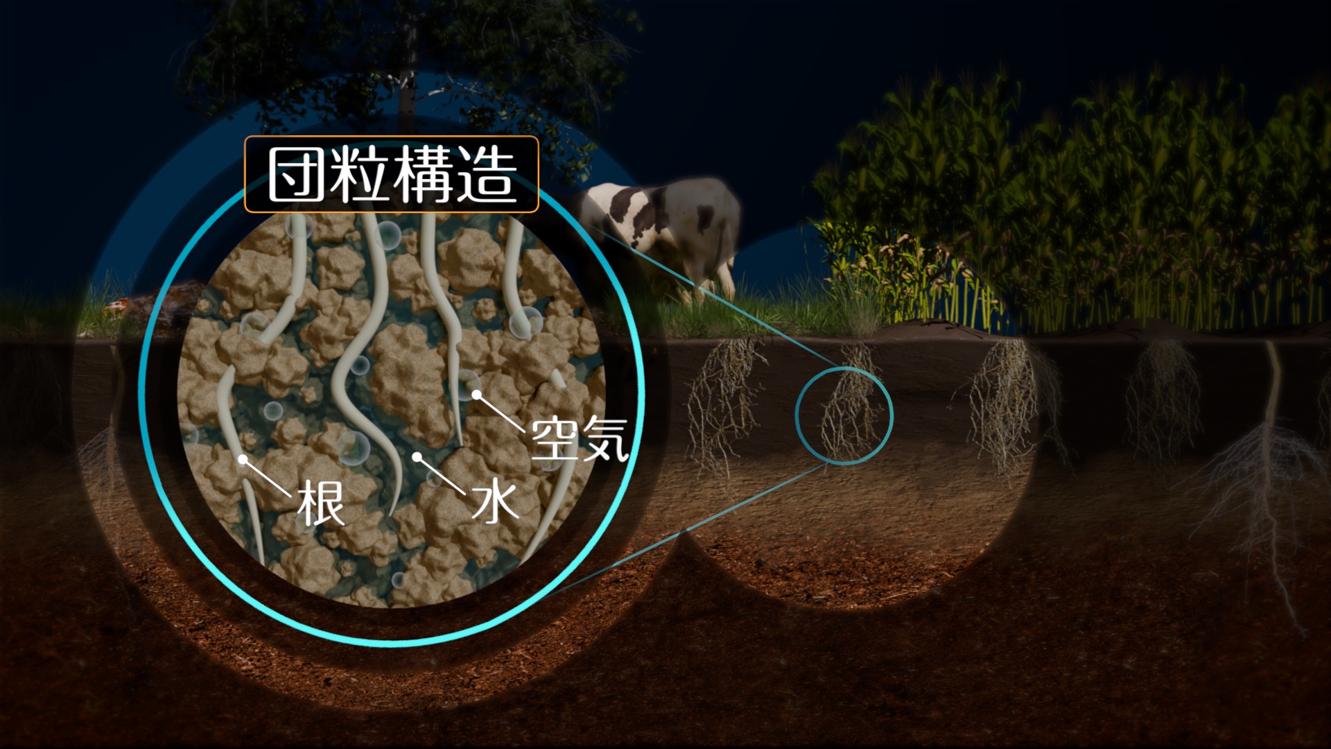 酪農が盛んな北海道で推進している気候変動対策の一環であるカーボンファーミング(炭素を土壌に貯留してCO2の増加を防ぐ農法)のプロモーション映像制作に伴い、仕組みを3Dアニメーションで制作するご依頼を受けました。北海道らしさの風景を箱庭のブロックに再現し、側面も植物の根が蔓延っている様子を描き、貯留する仕組みをわかりやすくアニメーションで表現しました。