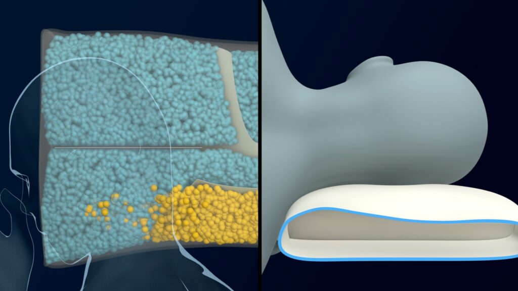 健康器具メーカー様の主力商品である高機能枕の機能をわかりやすく伝えたいと3Dアニメーションのご依頼を受けました。特徴としては、枕の中に縫い込んである仕切りによって中材の動きが首への負担が減るように作られていること。そのことが伝わるように枕と人体モデルを使って3Dアニメーションを制作しました。中材の動きは、3Dで制御するのはなかなか難しい複雑な動きを求められましたが、試行錯誤の上、満足頂ける仕上がりになりました。